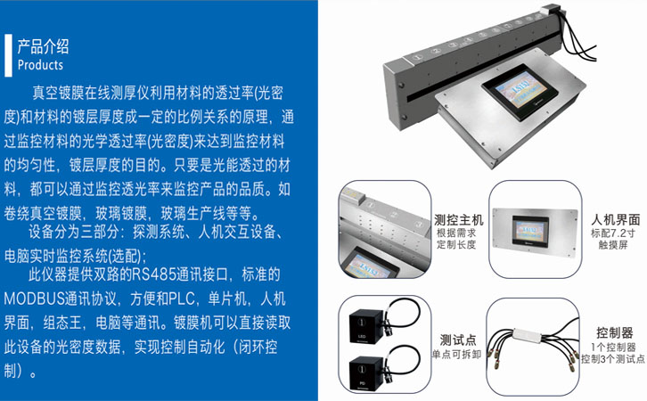 林上真空鍍膜在線測厚儀分為三部分:探測系統(tǒng)、人機交互設(shè)備、電腦實時監(jiān)控系統(tǒng)(選配);儀器提供雙路的RS485通訊接口,標(biāo)準(zhǔn)的MODBUS通訊協(xié)議,方便和PLC,單片機,人機界面,組態(tài)王,電腦等通訊。鍍膜機可以直接讀取此設(shè)備的光密度/透過率數(shù)據(jù),實現(xiàn)控制自動化(閉環(huán)控制)。歡迎廣大用戶來電咨詢!0755-27860706