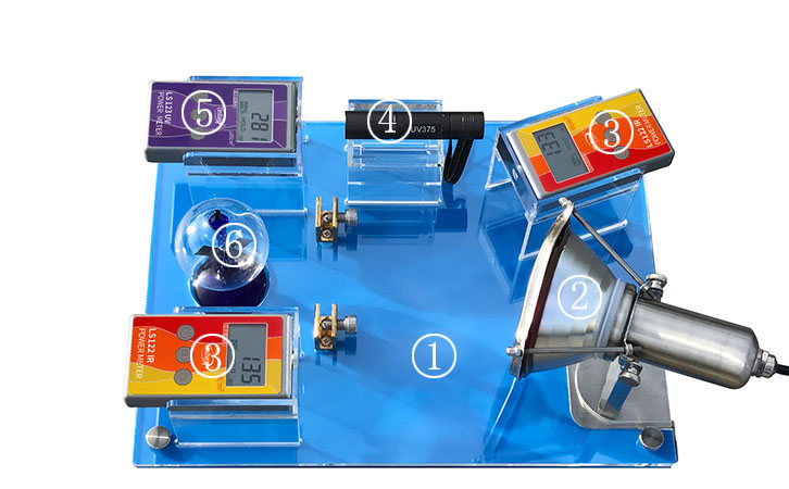 FS2150太陽膜反射測試儀用于展示太陽膜、隔熱玻璃等材料對光線的反射及阻隔效果。紅外線燈對面的LS122紅外功率計用于測試太陽膜,隔熱玻璃等的紅外線阻隔率,即隔熱效果;同側的LS122紅外功率計用于測試太陽膜,隔熱玻璃等的光反射能力大??;LS123紫外功率計測試太陽膜,隔熱玻璃等的隔紫外能力。光強魔鏡用于生動演示隔熱效果,光強魔鏡的葉片旋轉(zhuǎn)速度和光線的強度成正比。