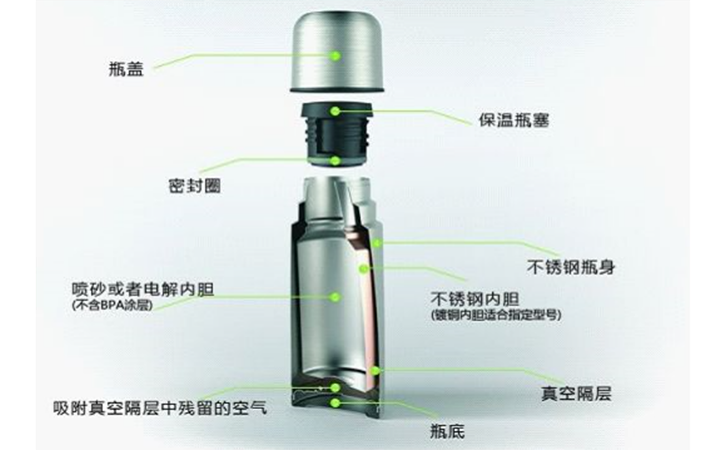 不銹鋼保溫杯內(nèi)膽外表面進(jìn)行鍍銅或者鍍銀,可有效減少杯內(nèi)與外界間的熱輻射,有效降低通過(guò)輻射丟失的熱量,增加保溫時(shí)間。