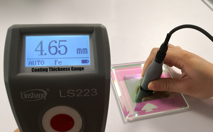3.調(diào)零完成后將待測(cè)的玻璃平放在調(diào)零板上,將探頭垂直按壓在玻璃表面。如果擔(dān)心自己的操作手勢(shì)不夠正確,可以進(jìn)行多次測(cè)量。儀器的測(cè)量間隔為0.5秒,我們可以通過(guò)多次測(cè)量得出的數(shù)據(jù)來(lái)確認(rèn)最終的玻璃厚度。