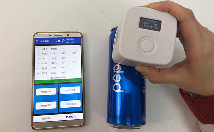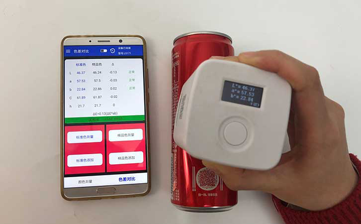 用色差儀對(duì)這兩個(gè)易拉罐的外觀顏色進(jìn)行檢測(cè)后,色差儀連接的App顯示這兩個(gè)易拉罐的不同部位都是沒(méi)有色差的。可口可樂(lè)公司和百事公司的品質(zhì)把控還是不錯(cuò)的。測(cè)量易拉罐這種圓柱形的樣品時(shí),我們應(yīng)該注意要用測(cè)量口完全覆蓋住罐體,也就是要用色差儀緊壓在易拉罐表面,防止漏光。這款色差儀采用的是積分球的原理,體積小巧,有顏色測(cè)量和色差對(duì)比兩個(gè)功能。色差儀價(jià)格也十分優(yōu)惠,是一款適合顏色測(cè)量并且經(jīng)濟(jì)適用的精密顏色測(cè)量?jī)x器。