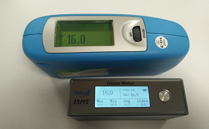 用60°的BYK光澤度儀與林上便攜式光澤度儀LS192來測量實物,直觀對比。