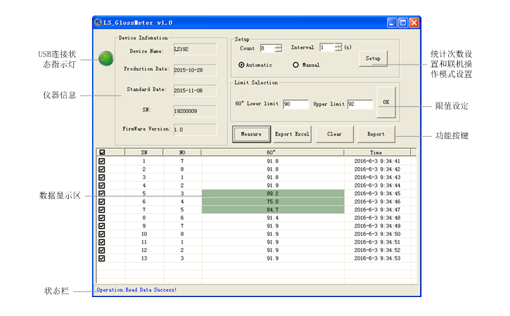 電腦軟件界面是由儀器信息欄,USB連接狀態(tài)指示燈,設置欄,功能按鍵和數據顯示區(qū)組成。