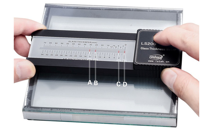 把玻璃測厚儀放置于中空玻璃的表面,按下電源開關(guān)并且保持不放,可見四條光線,其中D光條出廠時已經(jīng)校準(zhǔn)和零刻度線平齊,C光條在“玻璃厚度標(biāo)尺(GLASS THICKNESS)”上的讀數(shù)即為第一層玻璃的厚度。在“玻璃厚度標(biāo)尺”A光條的讀數(shù)減去B光條的讀數(shù)即為第二層玻璃的厚度,A = 30mm,B = 25mm,C = 5mm,D = 0mm。第一層玻璃的厚度為C – D = 5mm,第二層玻璃厚度為A - B = 5mm。